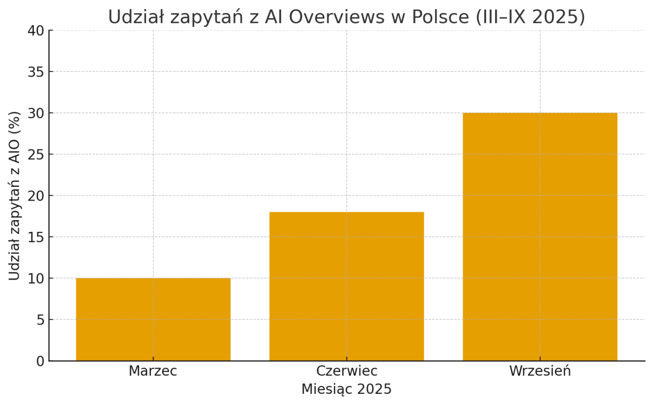 - seoClarity (23.10.2025, CET): udział słów z AIO wzrósł do 30% wyników desktop.