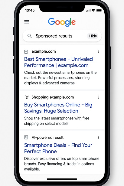 Wersja mobilna wyszukiwarki Google umożliwia zwijanie reklam za pomocą wbudowanego przycisku „Ukryj” widocznego po przewinięciu bloku. Na Androidzie funkcja działa w aplikacji Google (wersja 15.41 lub nowsza) oraz w przeglądarce Chrome. Po kliknięciu ikony × cały moduł „Wyniki sponsorowane” znika do momentu ponownego odświeżenia strony.