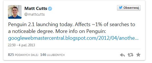 Poprawka do aktualizacji 2.0, która odcisnęła największe piętno na polskim rynku. Znów zapowiedzi o tym, że zmiany dosięgły tylko 1% wyników były mocno zaniżone. Z obserwacji polskiego rynku wynikało, że blisko 1/3 stron została nagrodzona karami za nienaturalne linki. To właśnie Pingwin 2.1, wypuszczony w październiku 2013 roku spustoszył polskie SERP’y i to ta aktualizacja odniosła się echem po szerokim Internecie, a także prasie.