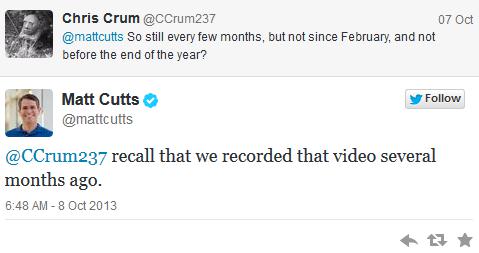 Wystarczy spojrzeć na to, co dzieje się z aktualizacjami PR oraz na to, jak Matt Cutts na swoim Twitterze wypowiada się na temat aktualizacji. Przypomnijmy, PR był aktualizowany cyklicznie, co 4-5 miesięcy. Ostatnia aktualizacja była w lutym bieżącego roku, mamy październik, 8 miesięcy od lutego a aktualizacji nadal nie widać. Do końca 2013 roku raczej nie powinniśmy spodziewać się aktualizacji, co potwierdzają poniższe wpisy oraz to, jak Google odnosi się do samego wskaźnika.